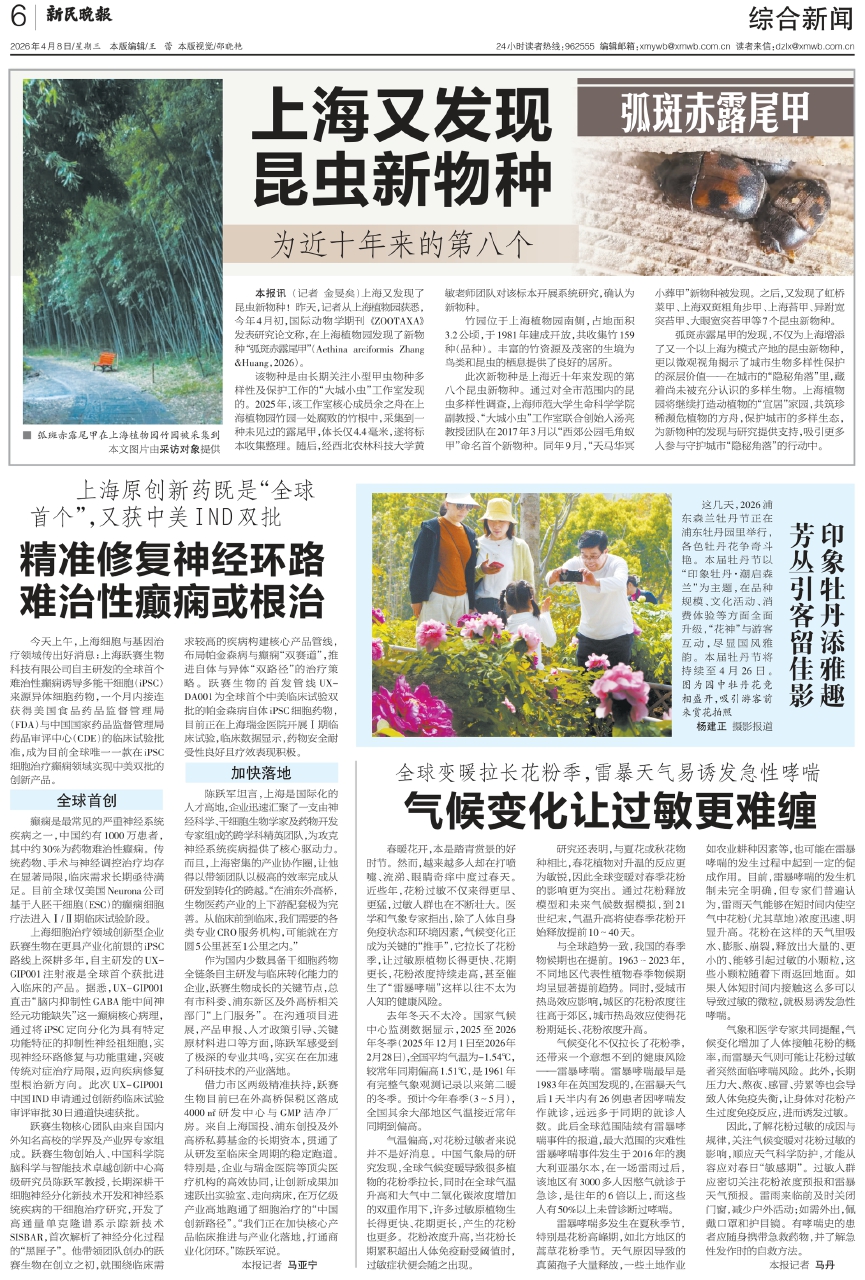 本报讯(记者 金旻矣)上海又发现了昆虫新物种!昨天,记者从上海植物园获悉,今年4月初,国际动物学期刊《ZOOTAXA》发表研究论文称,在上海植物园发现了新物种“弧斑赤露尾甲”(Aethina arciformis Zhang&Huang,2026)。