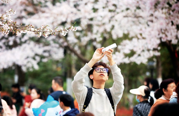 清明时节,不少年轻人在樱花树下来回穿梭,乐此不疲。赏花对他们来说或是一种从现实压力中的“微逃离”,从花中寻求慰藉,在花中感受青春。